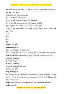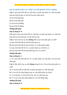 Đáp án đúng là: C. Có 3 đ c đi ă m ê đúng là: (1), (2), (3). (3) Sai. S n ả ph m â cu i ố cùng c a u quá trình phân gi i ả hi u khi ế là CO2 và nư c. ớ Câu 5: Trư ng h ờ p nào s ợ au đây có tốc đ phân gi ộ i ả hi u khi ế m nh nh ạ ất? A. Ngư i ờ đang ng . u B. Ngư i ờ đang đi b . ộ C. Ngư i ờ đang ch y ạ . D. Ngư i ờ đang ngôi ngh ng i i ơ . Hư ng d ớ ẫn gi i ả : Đáp án đúng là: C Cơ th ê càng tiêu th u nhi u ề năng lư ng ợ thì t c ố đ ộ phân gi i ả hi u ế khi càng m nh ạ → Trong các trư ng ờ h p ợ trên, ngư i ờ đang ch y ạ b ộ có t c ố đ ộ phân gi i ả hi u khi ế m nh ạ nh t ấ . Câu 6: Giai đo n nào ạ