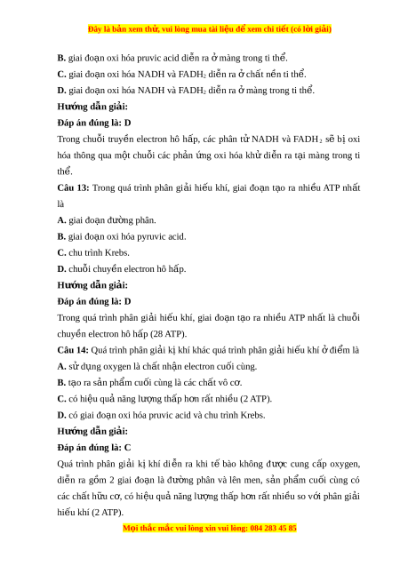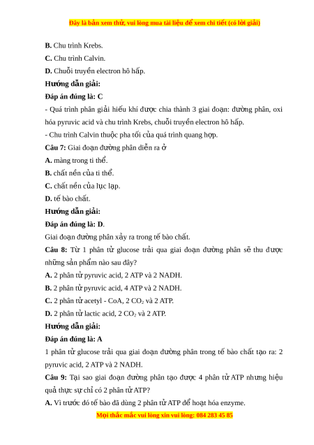 Đây là bản xem th , vu ử i lòng mua tài li u ệ đ xe ể m chi ti t ế (có l i ờ gi i ả ) B. Chu trình Krebs. C. Chu trình Calvin. D. Chuỗi truy n el ề ectron hô h p. ấ Hư ng ớ d n gi ẫ i ả : Đáp án đúng là: C - Quá trình phân gi i ả hi u ế khi đư c ợ chia thành 3 giai đo n: ạ đư ng ờ phân, oxi