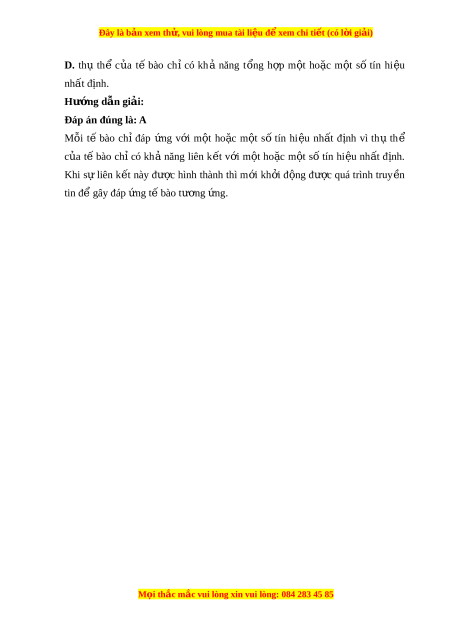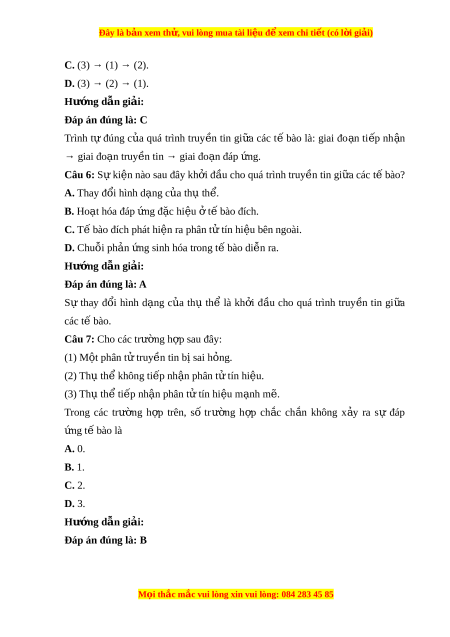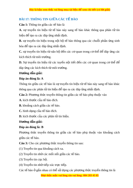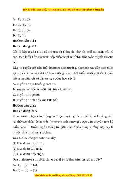 Đây là bản xem th , vu ử i lòng mua tài li u ệ đ xe ể m chi ti t (c ế ó l i ờ gi i ả ) A. (1), (2), (3). B. (1), (3), (4). C. (2), (3), (4). D. (3), (4). Hư ng d ớ ẫn gi i ả : Đáp án đúng là: C Các tế bào ở g n ầ nhau có th ể truy n ề thông tin nh ờ các m i ô n i ô gi a ữ các tế bào, theo ki u ể ti p ế xuc tr c ự ti p ế nh ờ các phân t ử b ề m t ă ho c ă truy n ề tin c c ụ b . ộ Câu 4: Tuy n ế yên s n ả xu t ấ hormone sinh trư ng, ở hormone này đ n ế kích thích s ự phân chia và keo dài t ế bào xư ng, ơ giup phát tri n ể xư ng. ơ Ki u ể truy n ề thông tin gi a các ữ t bào t ế rong trư ng h ờ p ơ này là A. truy n t ề in qua kho ng cách ả xa. B. truy n t ề in nhờ các môi n i ô gi a các ữ t bào. ế C. truy n t ề in c c b ụ . ộ D. truy n t ề in nh t ờ i p xuc t ế r c t ự i p. ế Hư ng d ớ ẫn gi i ả : Đáp án đúng là: A Trong trư ng ờ h p ơ trên, thông tin đư c ơ truy n ề gi a ữ các t ế bào ở kho ng ả cách xa nh ờ các phân t ử tín hi u ệ (hormone sinh trư ng) ở đư c ơ v n â chuy n ể nh ờ hệ tuần hoàn → Ki u ể truy n ề thông tin gi a ữ các t ế bào trong trư ng ờ h p ơ này là truy n t ề in qua kho ng cách ả xa.