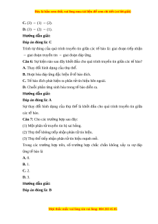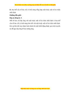ế các cơ quan trong cơ thể để đáp ng các ứ kích thích t m ừ ôi trư ng. ờ Hư ng ớ d n gi ẫ i ả : Đáp án đúng là: A Thông tin gi a ữ các t ế bào là s ự truy n ề tín hi u ệ t ừ t ế bào này sang t ế bào khác thông qua các phân t t ử ín hi u đ ệ t ể o ạ ra các đáp ng nh ứ t ấ đ nh. ị Câu 2: Phư ng ơ th c ứ truy n t ề hông tin gi a các ữ t bào ph ế t ụ hu c ộ vào A. kích thư c c ớ a u t bào đí ế ch. B. kho ng ả cách gi a ữ các t bào. ế C. hình d ng c ạ a u t bào đí ế ch. D. kích thư c c ớ a u các phân t t ử ín hi u. ệ Hư ng ớ d n gi ẫ i ả : Đáp án đúng là: B Phư ng ơ th c ứ truy n ề thông tin gi a ữ các tế bào phụ thu c ộ vào kho ng ả cách gi a các ữ t bào. ế