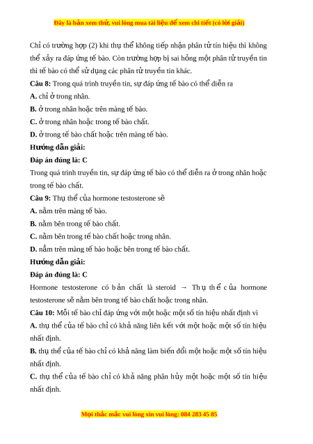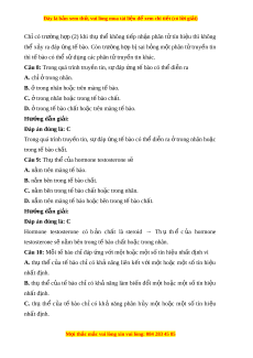 Câu 8: Trong quá trình truy n t ề in, s đáp ự ng ứ t bào có t ế h di ể n r ễ a A. chỉ t ở rong nhân. B. t ở rong nhân ho c t ă rên màng t bào. ế C. t ở rong nhân ho c ă trong t bào ế ch t ấ . D. t ở rong t bào ch ế t ấ ho c ă trên màng t bào. ế Hư ng d ớ ẫn gi i ả : Đáp án đúng là: C Trong quá trình truy n t ề in, s đáp ự ng ứ t bào có t ế h di ể n r ễ a t ở rong nhân ho c ă trong t bào ch ế ất. Câu 9: Th t ụ h c ể a u hormone testosterone sẽ A. n m ă trên màng t bào. ế B. n m ă bên trong t bào ch ế t ấ . C. n m ă bên trong t bào ế ch t ấ ho c t ă rong nhân. D. n m ă trên màng t bào ho ế c bên ă trong t bào ch ế t ấ . Hư ng d ớ ẫn gi i ả : Đáp án đúng là: C Hormone testosterone có b n ả ch t ấ là steroid → Th ụ th ể c a u hormone testosterone s n ẽ m ă bên trong t bào ch ế t ấ ho c t ă rong nhân.