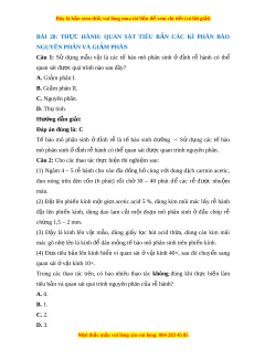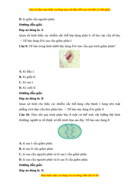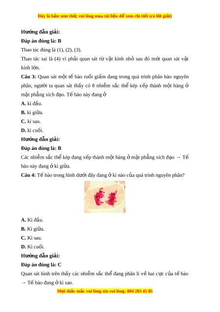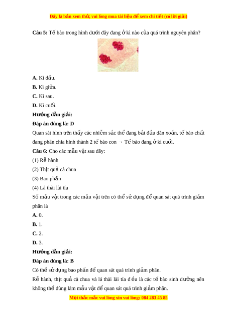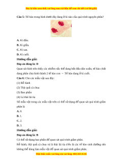 Đây là bản xem th , vu ử i lòng mua tài li u ệ đ xe ể m chi ti t ế (có l i ờ gi i ả ) Câu 5: T bào t ế rong hình dư i ơ đây đang kì ở nào c a quá t ủ rình nguyên phân? A. Kì đ u. ầ B. Kì gi a. ư C. Kì sau. D. Kì cuôi. Hư ng ớ d n gi ẫ i ả : Đáp án đúng là: D Quan sát hình trên th y â các nhi m ễ s c ắ th ể đang b t ắ đ u ầ dan xo n, ắ t ế bào ch t â
