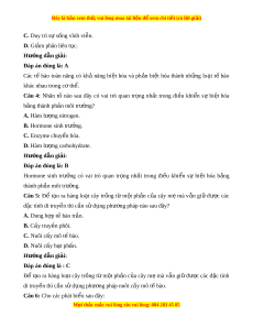B. Hormone sinh trư ng. ở C. Enzyme chuy n hóa. ể D. Hàm lư ng ợ carbohydrate. Hư ng d ớ ẫn gi i ả : Đáp án đúng là: B Hormone sinh trư ng ở có vai trò quan tr ng ọ nh t ấ trong đi u ề khi n ể sư bi t ệ hóa b ng ằ thành phần môi trư ng. ờ Câu 5: Để t o ạ ra hàng lo t ạ cây tr ng ồ t ừ m t ộ ph n ầ c a ủ cây m ẹ mà v n â gi ư đư c ợ các đ c ặ tinh di truy n t ề hì c n s ầ d ư ng ph ụ ư ng pháp ơ nào sau đây? A. Dung h p ợ t bào t ế r n. ầ B. Cấy truy n ề phôi.