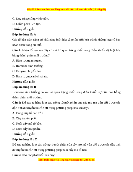 Đây là bản xem th , vu ử i lòng mua tài li u ệ đ xe ể m chi ti t (c ế ó l i ờ gi i ả ) C. Duy trì s s ư ống vĩnh vi n. ê D. Gi m ả phân liên t c. ụ Hư ng d ớ ẫn gi i ả : Đáp án đúng là: A Các t ế bào toàn năng có kh ả năng bi t ệ hóa và ph n ả bi t ệ hóa thành nh ng ư lo i ạ t ế bào khác nhau trong cơ th . ể