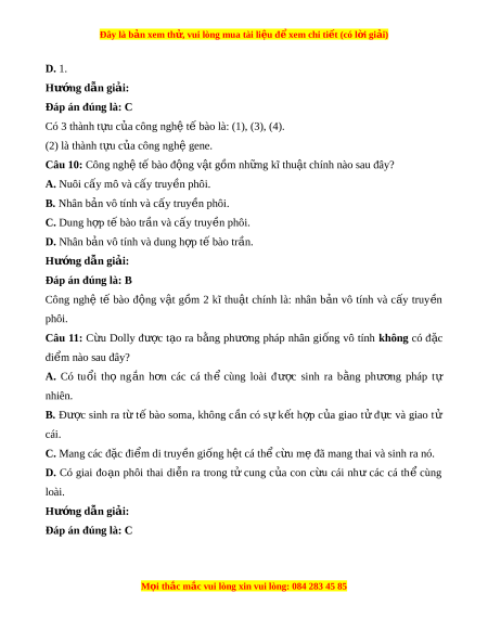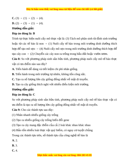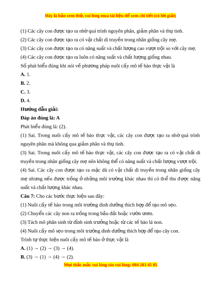 Đây là bản xem th , vu ử i lòng mua tài li u ệ đ xe ể m chi ti t (c ế ó l i ờ gi i ả ) (1) Các cây con đư c t ợ o ạ ra nh quá t ờ rình nguyên phân, gi m ả phân và th t ụ inh. (2) Các cây con đư c t ợ o ạ ra có v t ậ ch t ấ di truy n t ề rong nhân gi ng cây m ố . ẹ (3) Các cây con đư c t ợ o ạ ra có năng su t ấ và ch t ấ lư ng cao ợ vư t ợ tr i ộ so v i ớ cây m . ẹ (4) Các cây con đư c t ợ o ạ ra luôn có năng su t ấ và ch t ấ lư ng gi ợ ng nhau. ố Số phát bi u đúng khi ể nói v ph ề ư ng pháp ơ nuôi c y m ấ ô t bào ế th c ư v t ậ là A. 1. B. 2. C. 3. D. 4. Hư ng d ớ ẫn gi i ả :