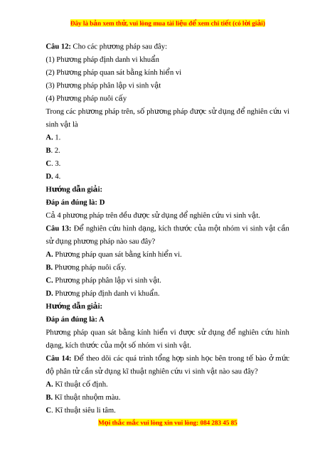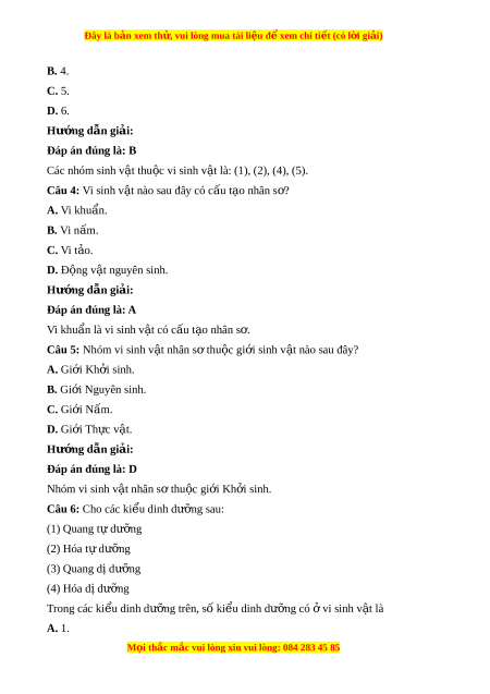 Đây là bản xem th , vu ử i lòng mua tài li u ệ đ xe ể m chi ti t (c ế ó l i ờ gi i ả ) B. 4. C. 5. D. 6. Hư ng d ớ ẫn gi i ả : Đáp án đúng là: B Các nhóm sinh v t ậ thu c vi ộ sinh v t ậ là: (1), (2), (4), (5). Câu 4: Vi sinh v t ậ nào sau đây có c u t ấ o nhân s ạ ? ơ A. Vi khuẩn. B. Vi nấm. C. Vi t o. ả D. Đ ng ộ v t ậ nguyên sinh. Hư ng d ớ ẫn gi i ả : Đáp án đúng là: A Vi khuẩn là vi sinh v t ậ có c u t ấ o nhân s ạ . ơ