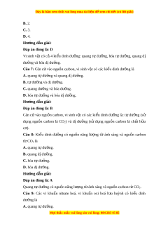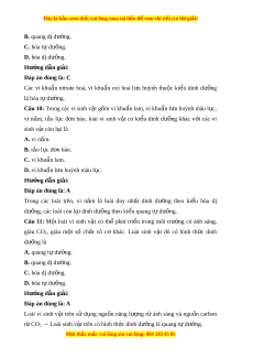 ụ nguồn carbon là CO2) và dị dư ng ỡ (sử d ng ụ ngu n ồ carbon là ch t ấ h u ữ c ) ơ . Câu 8: Ki u ể dinh dư ng ỡ có ngu n ồ năng lư ng ợ từ ánh sáng và ngu n ồ carbon t C ừ O2 là A. quang t d ự ư ng. ỡ B. quang dị dư ng. ỡ C. hóa t d ự ư ng. ỡ D. hóa dị dư ng. ỡ Hư ng ớ d n gi ẫ i ả : Đáp án đúng là: A Quang t d ự ư ng ỡ có nguồn năng lư ng t ợ ánh s ừ áng và ngu n car ồ bon t C ừ O2. Câu 9: Các vi khu n ẩ nitrate hoá, vi khu n ẩ oxi hoá l u ư huỳnh có ki u ể dinh dư ng l ỡ à A. quang t d ự ư ng. ỡ M i