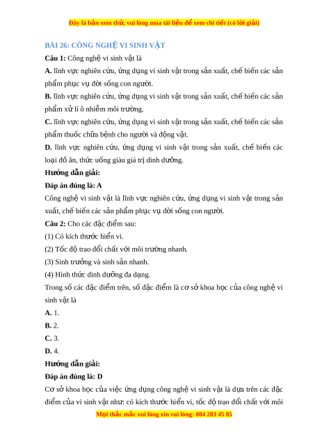 Đây là bản xem th , vu ử i lòng mua tài li u ệ đ xe ể m chi ti t ế (có l i ờ gi i ả ) BÀI 26: CÔNG NGH Ệ VI SINH V T Ậ Câu 1: Công ngh v ệ i sinh v t ậ là A. lĩnh v c nghi ự ên c u, ứ ng ứ d ng vi ụ sinh v t ậ trong s n ả xu t ấ , ch ế bi n ế các s n ả ph m ẩ ph c ụ v đ ụ i ờ s ng con ng ố ư i ờ . B. lĩnh v c ự nghiên c u, ứ ng ứ d ng ụ vi sinh v t ậ trong s n ả xu t ấ , ch bi ế n ế các s n ả ph m ẩ x l ư i ô nhi m ê môi trư ng. ờ C. lĩnh v c nghi ự ên c u, ứ ng ứ d ng vi ụ sinh v t ậ trong s n ả xu t ấ , ch ế bi n ế các s n ả ph m ẩ thuốc ch a ư b nh cho ng ệ ư i ờ và đ ng v ô t ậ . D. lĩnh v c ự nghiên c u, ứ ng ứ d ng ụ vi sinh v t ậ trong s n ả xu t ấ , chế bi n ế các lo i a đô ăn, th c u ứ ống giàu giá tr di i nh dư ng. ơ Hư ng ớ d n gi ẫ i ả : Đáp án đúng là: A Công nghệ vi sinh v t ậ là lĩnh v c ự nghiên c u, ứ ng ứ d ng ụ vi sinh v t ậ trong s n ả xu t ấ , chế bi n các s ế n ph ả ẩm ph c v ụ ụ đ i ờ sống con ngư i ờ . Câu 2: Cho các đ c ă đi m ê sau: (1) Có kich thư c ớ hi n vi ê . (2) Tốc đ t ô rao đổi ch t ấ v i ớ môi trư ng nhanh. ờ (3) Sinh trư ng ở và sinh s n nhanh. ả (4) Hình th c di ứ nh dư ng ơ đa d ng. a Trong s ố các đ c ă đi m ê trên, s ố đ c ă đi m ê là c ơ s ở khoa h c ọ c a u công ngh ệ vi sinh v t ậ là A. 1. B. 2. C. 3. D. 4. Hư ng ớ d n gi ẫ i ả : Đáp án đúng là: D Cơ sở khoa h c ọ c a u vi c ệ ng ứ d ng ụ công nghệ vi sinh v t ậ là d a ự trên các đ c ă đi m ê c a u vi sinh v t ậ nh : ư có kich thư c ớ hi n ê vi, t c ố đ ô trao đ i ổ ch t ấ v i ớ môi M i