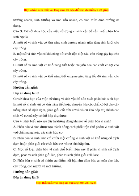 Đây là bản xem th , vu ử i lòng mua tài li u ệ đ xe ể m chi ti t (c ế ó l i ờ gi i ả ) trư ng ờ nhanh, sinh trư ng ở và sinh s n ả nhanh, có hình th c ứ dinh dư ng ơ đa d ng. a Câu 3: Cơ s ở khoa h c ọ c a u vi c ệ s ư d ng ụ vi sinh v t ậ đ ê s n ả xu t ấ phân bón sinh h c l ọ à A. m t ô số vi sinh v t ậ có kh ả năng sinh trư ng ở nhanh giup tăng sinh kh i ố cho cây trông. B. m t ô số vi sinh v t ậ có kh năng ả ti t ế ch t ấ đ c ô di t ệ sâu, côn trung gây h i a cho cây trông. C. m t ô s ố vi sinh v t ậ có kh ả năng ti t ế ho c ă chuy n ê hóa các ch t ấ có l i ơ cho cây trông. D. m t ô số vi sinh v t ậ có kh ả năng ti t ế enzyme giup tăng t c ố đ ô sinh s n ả cho cây trông. Hư ng d ớ ẫn gi i ả : Đáp án đúng là: C Cơ s ở khoa h c ọ c a u vi c ệ s ư d ng ụ vi sinh v t ậ đ ê s n ả xu t ấ phân bón sinh h c ọ là m t ô số vi sinh v t ậ có kh năng ả ti t ế ho c ă chuy n ê hóa các ch t ấ có l i ơ cho cây trông như c ố đ nh i đ m a , phân gi i ả c t ấ h u ư c ơ và vô c ơ khó h p ấ th ụ thành các