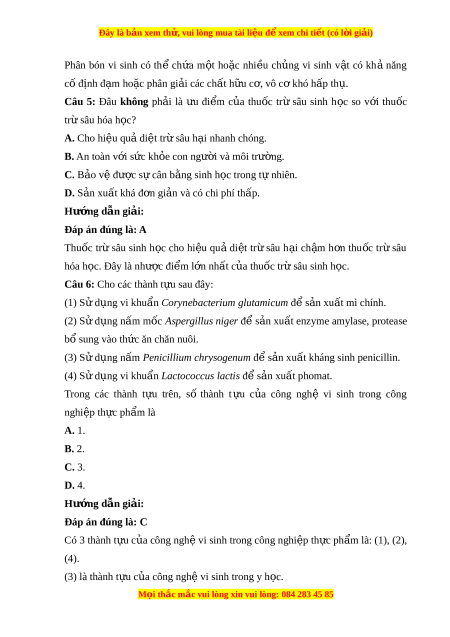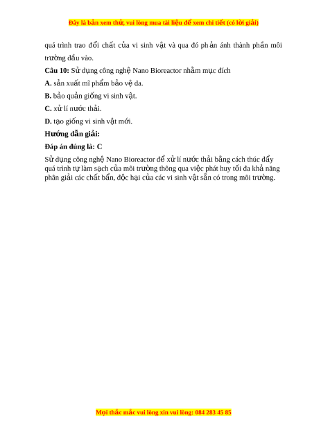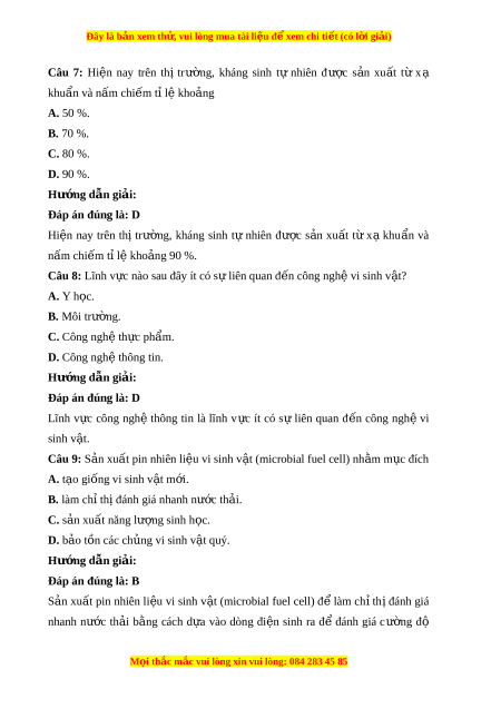 Đây là bản xem th , vu ử i lòng mua tài li u ệ đ xe ể m chi ti t (c ế ó l i ờ gi i ả ) Câu 7: Hi n ệ nay trên th itrư ng, ờ kháng sinh t ự nhiên đư c ơ s n ả xu t ấ t ư xa khuẩn và nấm chi m ế ti l kho ệ ng ả A. 50 %. B. 70 %. C. 80 %. D. 90 %. Hư ng d ớ ẫn gi i ả : Đáp án đúng là: D Hiện nay trên th i trư ng, ờ kháng sinh t ự nhiên đư c ơ s n ả xu t ấ t ư x a khu n ẩ và nấm chi m ế ti l kho ệ ng 90 % ả . Câu 8: Lĩnh v c ự nào sau đây it có s l ự iên quan đ n ế công ngh v ệ i sinh v t ậ ? A. Y h c. ọ B. Môi trư ng. ờ C. Công ngh t ệ h c ự ph m ẩ . D. Công ngh t ệ hông tin. Hư ng d ớ ẫn gi i ả : Đáp án đúng là: D Lĩnh v c ự công ngh ệ thông tin là lĩnh v c ự it có s ự liên quan đ n ế công ngh ệ vi sinh v t ậ . Câu 9: S n xu ả ất pin nhiên li u vi ệ sinh v t ậ (microbial fuel cell) nh m ă m c đi ụ ch A. t o a giống vi sinh v t ậ m i ớ . B. làm chi th đánh i giá nhanh nư c t ớ h i ả . C. s n xu ả ất năng lư ng s ơ inh h c. ọ D. b o ả tôn các ch ng vi u sinh v t ậ quy. Hư ng d ớ ẫn gi i ả : Đáp án đúng là: B S n ả xu t ấ pin nhiên li u ệ vi sinh v t ậ (microbial fuel cell) đ ê làm ch ith iđánh giá nhanh nư c ớ th i ả b ng ă cách d a ự vào dong đi n ệ sinh ra đ ê đánh giá cư ng ờ đô M i ọ thắc m c