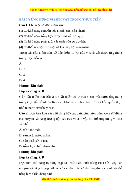 Đây là bản xem th , vu ử i lòng mua tài li u ệ đ xe ể m chi ti t ế (có l i ờ gi i ả ) BÀI 27: N Ứ G D N Ụ G VI SINH V T Ậ TRONG TH C Ự TI N Ễ Câu 1: Cho m t ô sô đ c ă đi m ê sau: (1) Co kh năng chuy a n hoa ê m nh, s a inh s n nhanh a (2) Co kh năng t a ông h p đ ơ ư c m ơ t ô sô chât quy (3) Co kh năng phân gi a i a cac chât h u c ư d ơ ư th a ư (4) Co th gây ê đ c cho m ô t ô sô loai gây h i a mua mang Trong cac đ c ă đi m ê trên, s ô đ c ă đi m ê co l i ơ c a u vi sinh v t â đư c ơ ng ư d ng u trong th c ư ti n ê la A. 1. B. 2. C. 3. D. 4. Hư ng ớ d n gi ẫ i ả :