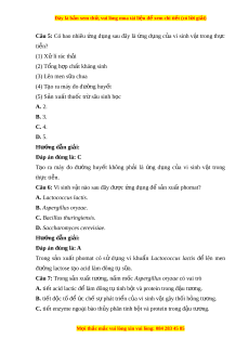 Đáp án đúng là: D C 4 đ a c đi ă m ê trên đ u l ê a cac đ c đi ă m ê co l i ơ c a vi u sinh v t â đư c ơ ng d ư ng u trong th c ư ti n ê ơ nhi u ê linh v c ư khac nhau như ch ê bi n ê va b o a qu n a th c ư phâm, nông nghi p, y h ê c,… o Câu 2: D a ư trên kha năng tư t ng ô h p ơ cac ch t â c n ầ thi t ê b ng ằ cach s ử d ng u cac enzyme va năng lư ng ơ n i ô bao c a u vi sinh v t â , co thê ng ư d ng u vi sinh v t â đê A. x l ử í rac th i a . B. s n xu a ât nư c ớ m m ắ . C. s n a xu t â s a chua. ư D. tông h p ơ ch t â khang sinh. Hư ng ớ d n gi ẫ i ả : Đáp án đúng là: D D a ư trên kha năng tư t ng ô h p ơ cac ch t â c n ầ thi t ê b ng ằ cach sử d ng u cac enzyme va năng lư ng ơ n i ô bao c a u vi sinh v t â , co th ê ng ư d ng u vi sinh v t â đê tông h p ơ chât khang sinh. M i