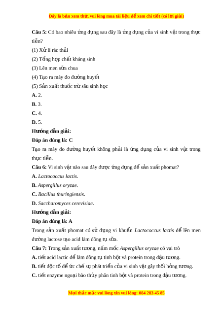Câu 5: Co bao nhiêu ng ư d ng u sau đây la ng ư d ng u c a u vi sinh v t â trong th c ư ti n? ê (1) X l ử í rac th i a (2) Tông h p ch ơ ât khang sinh (3) Lên men s a ư chua (4) T o a ra may đo đư ng huy ờ t ê (5) S n xu a ât thuôc tr s ư âu sinh h c o A. 2. B. 3. C. 4. D. 5. Hư ng ớ d n gi ẫ i ả : Đáp án đúng là: C T o a ra may đo đư ng ờ huy t ê không ph i a la ng ư d ng u c a u vi sinh v t â trong th c t ư i n. ê Câu 6: Vi sinh v t â nao sau đây đư c ơ ng d ư ng đ u s ê n xu a t â phomat?