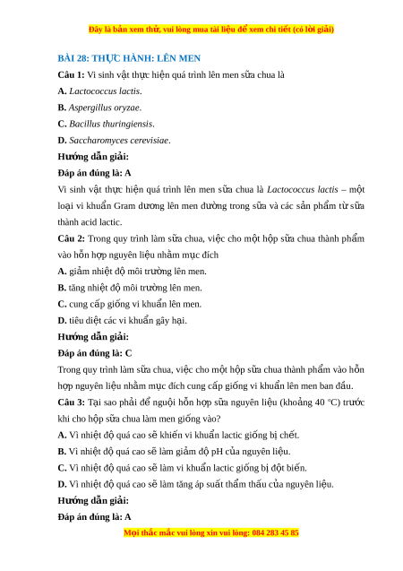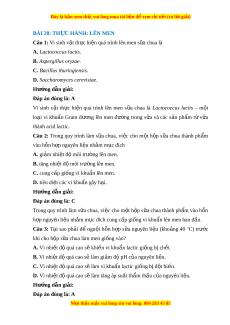 Đây là bản xem th , vu ử i lòng mua tài li u ệ đ xe ể m chi ti t ế (có l i ờ gi i ả ) BÀI 28: TH C Ự HÀNH: LÊN MEN Câu 1: Vi sinh v t â th c hi ư n qua t ê rinh lên men s a ư chua la