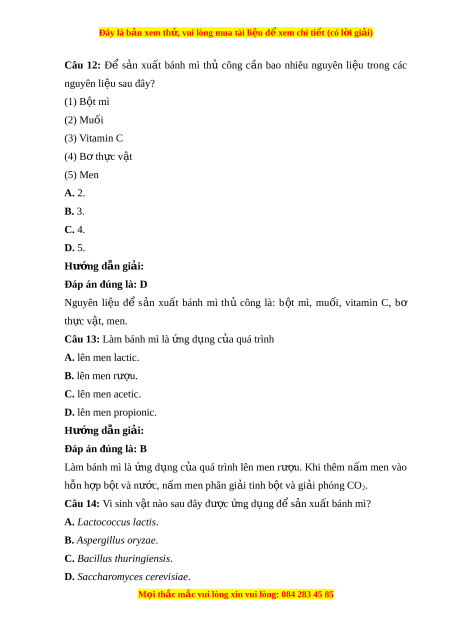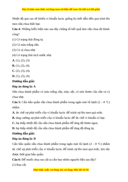 Đây là bản xem th , vu ử i lòng mua tài li u ệ đ xe ể m chi ti t (c ế ó l i ờ gi i ả ) Nhiêt đ ô qua cao s e khi n ê vi khu n â lactic gi ng ố b ich t ê dân đ n ê qua trinh lên men s a chua ư th t ấ b i a . Câu 4: Nh ng ư bi u ê hi n ê nao sau đây ch ng ư t o k t ê qu a lam s a ư chua đa thanh công? (1) Co tr ng a thai đông tụ (2) Co mau tr ng ă s a ư (3) Co vi chua nhe (4) Co tr ng a thai tach nư c ơ nhe A. (1), (2), (3). B. (1), (2), (4). C. (2), (3), (4). D. (1), (3), (4). Hư ng d ớ ẫn gi i ả :