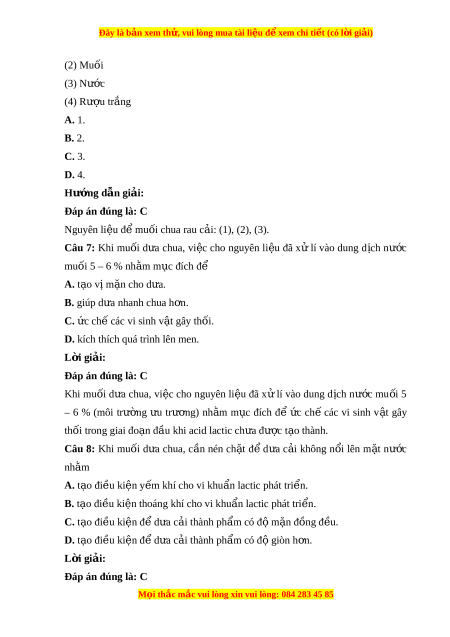 Đây là bản xem th , vu ử i lòng mua tài li u ệ đ xe ể m chi ti t ế (có l i ờ gi i ả ) (2) Muối (3) Nư c ơ (4) Rư u ơ tr ng ă A. 1. B. 2. C. 3. D. 4. Hư ng ớ d n gi ẫ i ả : Đáp án đúng là: C Nguyên li u đ ê m ê u i ố chua rau c i a : (1), (2), (3). Câu 7: Khi mu i ố d a ư chua, vi c ê cho nguyên li u ê đa x ư lí vao dung d ch i nư c ơ muối 5 – 6 % nh m ằ m c ụ đích đê A. t o v a i m n cho ă d a. ư B. giup d a ư nhanh chua h n. ơ C. c ch ư cac ê vi sinh v t â gây th i ố .