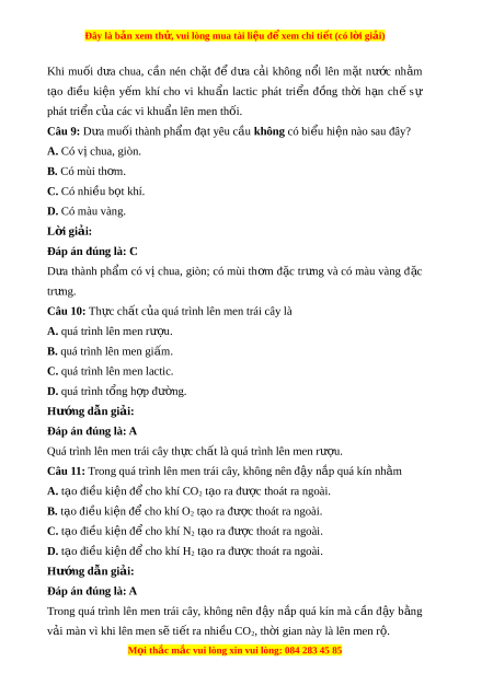 D. kích thích qua trinh lên men. L i ờ giải: Đáp án đúng là: C Khi mu i ố d a ư chua, vi c ê cho nguyên li u ê đa x ư lí vao dung d ch i nư c ơ mu i ố 5 – 6 % (môi trư ng ơ u ư trư ng) ơ nh m ằ m c ụ đích đ ê c ư ch ê cac vi sinh v t â gây thối trong giai đo n đ a u khi â acid lactic ch a ư đư c ơ t o t a hanh. Câu 8: Khi mu i ố d a ư chua, c n â nen ch t ă đ ê d a ư c i a không n i ô lên m t ă nư c ơ nh m ằ A. t o đi a u ki ê ên y m ê khí cho vi khu n l â actic phat tri n. ê B. t o a đi u ki ê n t ê hoang khí cho vi khu n l â actic phat tri n. ê C. t o đi a u ki ê ên đ d ê a ư c i a thanh ph m â co đ m ô n ă đ ng đ ô u. ê D. t o đi a u ki ê ên đ d ê a ư c i a thanh ph m â co đ gi ô on h n. ơ L i ờ giải: Đáp án đúng là: C M i