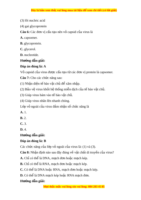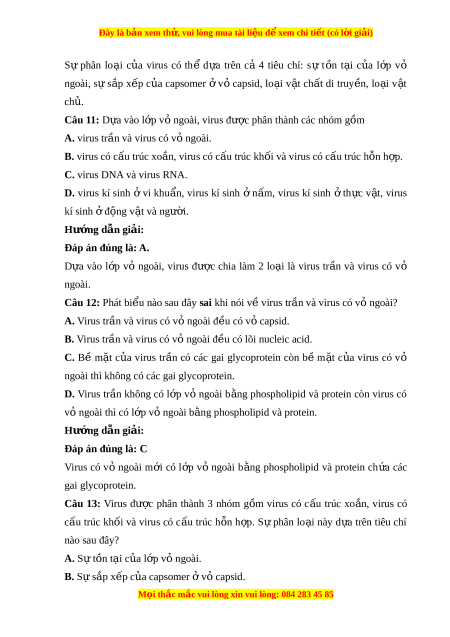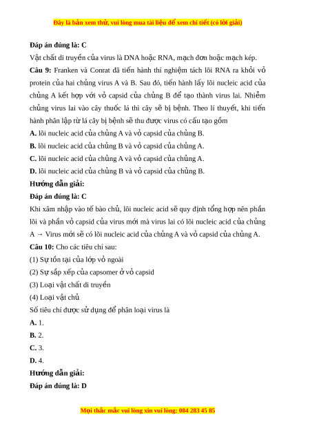 Đây là bản xem th , vu ử i lòng mua tài li u ệ đ xe ể m chi ti t (c ế ó l i ờ gi i ả ) Đáp án đúng là: C V t ậ chất di truy n c ề a ủ virus là DNA ho c R ặ NA, m ch đ ạ n ho ơ c m ặ ch ạ kep.