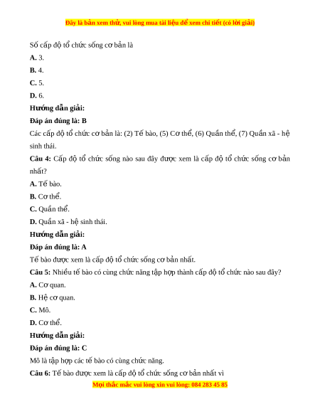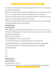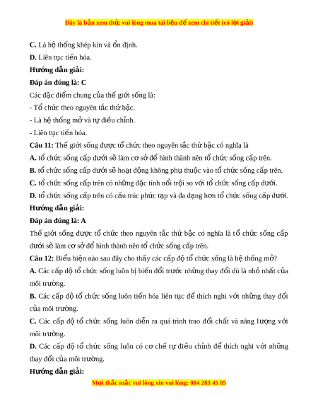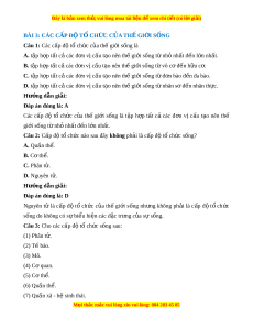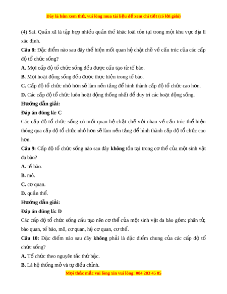 Đây là bản xem th , vu ử i lòng mua tài li u ệ đ xe ể m chi ti t (c ế ó l i ờ gi i ả ) (4) Sai. Qu n ầ xã la t p â h p ơ nhi u ề qu n ầ th ể khác loai t n ồ t i a trong m t ộ khu v c ư đ a i li xác đinh. Câu 8: Đ c ă đi m ể nao sau đây th hi ể n m ê i ố quan h ch ê t ă ch e v ề c u t ấ rúc c a ủ các c p ấ đ t ộ ổ ch c ứ sống? A. M i o cấp đ t ộ ổ ch c s ứ ống đ u ề đư c c ơ ấu t o t a t ư bao. ế B. M i o ho t a đ ng s ộ ống đ u đ ề ư c t ơ h c hi ư n t ê rong t bao. ế C. Cấp đ t ộ ổ ch c ứ nh h o n s ơ e lam n n t ề ng đ a hi ể nh thanh c p đ ấ t ộ ch ổ c ứ cao h n. ơ D. Các cấp đ t ộ ổ ch c l ứ uôn ho t a đ ng t ộ hống nhất đ duy t ể ri các ho t a đ ng s ộ ng. ố Hư ng d ớ ẫn gi i ả :