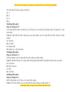 Câu 4: Cấp độ tổ ch c ứ s ng ố nao sau đây đư c ơ xem la c p ấ độ tổ ch c ứ s ng ố cơ b n a nhất? A. T bao. ế B. C t ơ h . ể C. Quần th . ể D. Quần xã - h s ê inh thái. Hư ng d ớ ẫn gi i ả : Đáp án đúng là: A T bao đ ế ư c ơ xem la c p đ ấ t ộ ổ ch c s ứ ống cơ b n nh a ất. Câu 5: Nhi u t ề bao co cùng ế ch c năng t ứ p â h p t ơ hanh c p đ ấ t ộ ổ ch c nao s ứ au đây? A. Cơ quan. B. Hê c quan. ơ C. Mô. D. Cơ th . ể Hư ng d ớ ẫn gi i ả : Đáp án đúng là: C Mô la t p h â p ơ các t bao co cùng ế ch c năng. ứ Câu 6: T bao đ ế ư c ơ xem la cấp đ t ộ ổ ch c s ứ ống cơ b n nh a ất vi M i ọ thắc m c