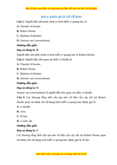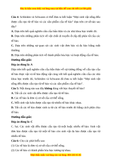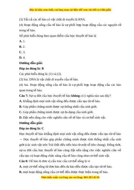 Đây là bản xem th , vu ử i lòng mua tài li u ệ đ xe ể m chi ti t ế (có l i ờ gi i ả ) (3) Tất c các ả t bao co v ế t ậ ch t ấ di truy n l ề a RNA. (4) Ho t ạ đ ng ô s ng ố c a ủ t ế bao la s ư ph i ố h p ơ ho t ạ đ ng ô c a ủ các nguyên tư trong t bao. ế Số phát bi u đúng t ể heo quan đi m ể c a h ủ c ọ thuy t ế t bao l ế a A. 1. B. 2. C. 3. D. 4. Hư ng ớ d n gi ẫ i ả : Đáp án đúng là: B Các phát bi u đúng l ể a: (1) va (2). (3) Sai. DNA la v t ậ ch t ấ di truy n c ề a ủ t bao. ế (4) Sai. Ho t ạ đ ng ô s ng ố c a ủ t ế bao la s ư ph i ố h p ơ ho t ạ đ ng ô c a ủ các bao quan trong t bao. ế Câu 7: S r ư a đ i ờ c a ủ h c t ọ huy t ế t bao ế