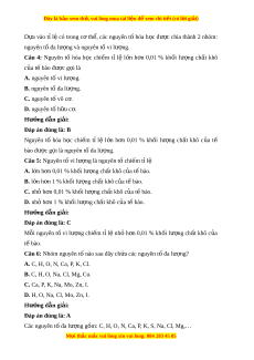 Câu 5: Nguyên tố vi lư ng l ơ à nguyên tố chi m ế tỉ lệ A. l n h ớ n ơ 0,01 % khối lư ng ch ơ t â khô c a u t bào. ế B. l n h ớ n 1 % ơ khối lư ng ơ ch t â khô c a t u bào. ế C. nhỏ h n 0,01 % ơ khối lư ng ch ơ t â khô c a u t bào. ế D. nhỏ h n 1 % ơ khối lư ng ch ơ t â khô c a u t bào. ế Hư ng d ớ ẫn gi i ả : Đáp án đúng là: C Môi nguyên t ố vi lư ng ơ chi m ế t ỉl ệ nh ỏ h n ơ 0,01 % kh i ố lư ng ơ ch t â khô c a u t bào. ế