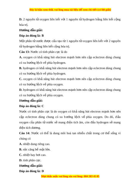 Đáp án đúng là: A I là thành ph n ầ c u â t o ạ c a u hormone thyroxine co ch c ứ năng kich thich chuy n ê hoa ơ t ế bào, kich thich s ư phat tri n ê binh thư ng ơ c a u h ệ th n ầ kinh, thi u I ế s gây r e a b nh b ệ ư u c ớ ô. Câu 12: M t ô phân t n ư ư c đ ớ ư c ơ c u t â o t ạ ư A. 1 nguyên t ư oxygen liên k t ế v i ớ 2 nguyên t ư hydrogen b ng ă liên k t ế hydrogen. B. 1 nguyên t ư oxygen liên k t ế v i ớ 2 nguyên t ư hydrogen b ng ă liên k t ế c ng ô hoa tri. C. 2 nguyên t ư oxygen liên k t ế v i ớ 1 nguyên t ư hydrogen b ng ă liên k t ế hydrogen. M i ọ thắc m c