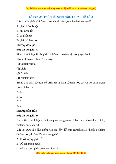 Đây là bản xem th , vu ử i lòng mua tài li u ệ đ xe ể m chi ti t ế (có l i ờ gi i ả ) BÀI 6: CÁC PHÂN T SI Ử NH H C Ọ TRONG T B Ế ÀO Câu 1: Các phân t h ử u c ữ ơ do sinh v t ậ sống t o t ạ hành đư c ợ g i ọ là A. phân t s ử inh h c. ọ B. đ i ạ phân t . ử C. đa phân t . ử D. phân t hóa h ử c. ọ Hư ng ớ d n gi ẫ i ả : Đáp án đúng là: A Phân t s ử inh h c ọ là các phân tử h u c ữ do s ơ inh v t ậ s ng t ố o ạ thành.