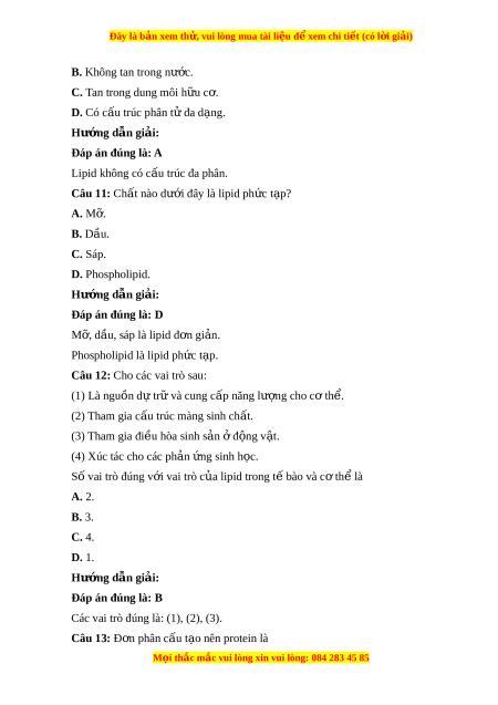 Câu 10: Lipid không có đ c ặ đi m ể nào sau đây?