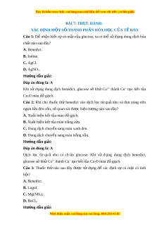 Đây là bản xem th , vu ử i lòng mua tài li u ệ đ xe ể m chi ti t ế (có l i ờ gi i ả ) BÀI 7: TH C Ự HÀNH: XÁC Đ N Ị H M T Ộ S Ố THÀNH PH N Ầ HÓA H C Ọ C A Ủ T B Ế ÀO Câu 1: Để nh n ậ bi t ế s ự có m t ặ c a ủ glucose, ta có th ể s ử d ng ụ dung d ch ị hóa chất nào sau đây? A. Benedict. B. Iodine. C. AgCl. D. AgNO3. Hư ng ớ d n gi ẫ i ả : Đáp án đúng là: A Khi s ử d ng ụ dung d ch ị benedict, glucose se kh ử Cu2+ thành Cu+ t o a k t ế t a ủ Cu2O màu đ g o ch. a Câu 2: Khi cho thu c