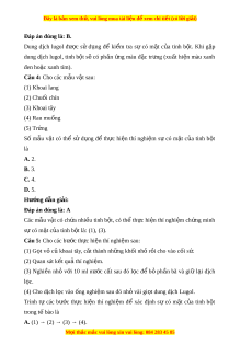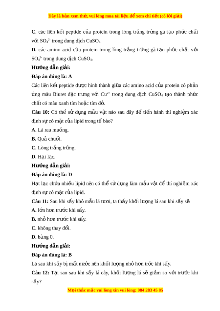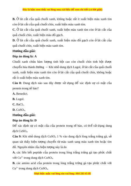 Đáp án đúng là: A Chuối xanh ch a ư hàm lư ng ơ tinh b t ộ cao con chu i ố chin tinh b t ộ đư c ơ chuy n ể hóa thành đư ng ơ → Khi nh o dung d ch ị Lugol, l ơ at c t ă c a ủ qu a chu i ố xanh, xu t ấ hi n ê màu xanh tim con ơ lat c t ă c a ủ qu a chu i ố chin, không ho c ặ rất it xu t ấ hi n m ê àu xanh tim. Câu 8: Dung d ch ị nào sau đây đư c ơ sử d ng ụ để xac đ nh ị sự có m t ặ c a ủ protein trong t bào ế ? A. Benedict. B. Lugol. C. BaCl2. D. CuSO4. Hư ng d ớ ẫn gi i ả : Đáp án đúng là: D Để xac đ nh ị sự có m t ặ c a ủ c a ủ protein trong t ế bào, có th ể s ử d ng ụ dung dịch CuSO4. Câu 9: Khi nh o dung d ch ị CuSO4 1 % vào dung d ch ị long tr ng ă tr ng ư gà, se quan sat th y ấ hi n ê tư ng ơ chuy n ể t