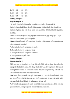 D. (2) → (4) → (1) → (3). Hư ng ớ d n gi ẫ i ả : Đáp án đúng là: B Cac bư c t ớ h c hi ự n t ê hi nghi m ê xac đ nh s ị có ự m t ặ c a t ủ inh b t ộ là: Bư c ớ 1: G t o v c o ủ khoai tây, c t ă thành nh ng kh ư i ố nh r o i ô cho vào c i ố s . ư Bư c ớ 2: Nghi n ề nho v i ớ 10 ml nư c ớ c t ấ sau đó l c o đ ể b o ph n â ba và gi ư l i a dịch l c. o Bư c ớ 3: Cho d ch l ị c vào o ng nghi ố m ê sau đó nh vài o gi t o dung d ch L ị ugol. Bư c ớ 4: Quan sat k t ế qu t a hi nghi m ê . Câu 6: Khi nho thu c