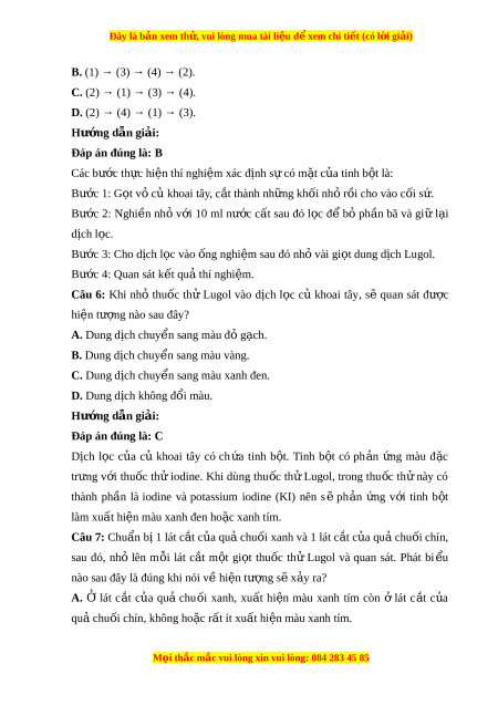 Câu 4: Cho cac mẫu v t ậ sau: (1) Khoai lang (2) Chuối chin (3) Khoai tây (4) Rau mu ng ố (5) Tr ng ư Số mẫu v t ậ có thể sử d ng ụ để th c ự hi n ê thi nghi m ê sự có m t ặ c a ủ tinh b t ộ là A. 2. B. 3. C. 4. D. 5. Hư ng d ớ ẫn gi i ả :