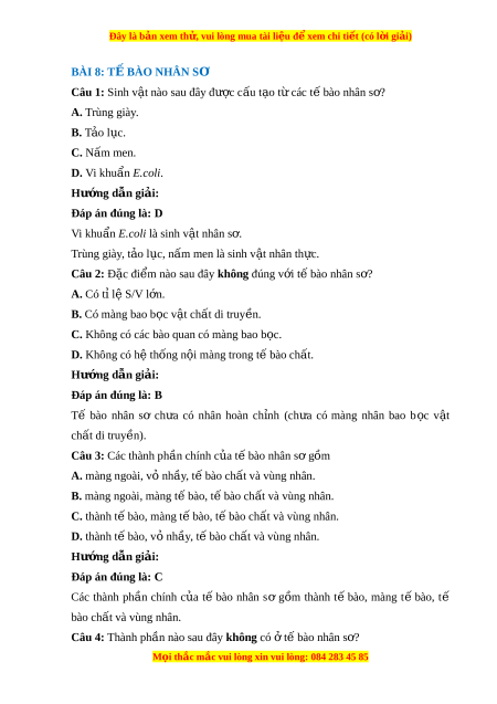 Đây là bản xem th , vu ử i lòng mua tài li u ệ đ xe ể m chi ti t ế (có l i ờ gi i ả ) BÀI 8: T B Ế ÀO NHÂN SƠ Câu 1: Sinh v t â nao sau đây đư c c ơ u t â o t a cac ư t bao nhân s ê ? ơ A. Trùng giay. B. T o a l c. u C. Nâm men.