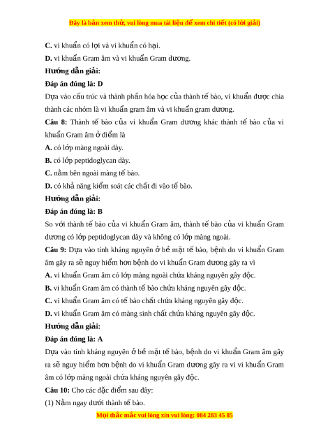 D. vi khuân Gram âm co mang sinh ch t â ch a khang nguyên ư gây đ c. ô Hư ng ớ d n gi ẫ i ả : Đáp án đúng là: A D a ư vao tinh khang nguyên ở b ê m t ặ t ê bao, b nh ê do vi khu n â Gram âm gây ra s e nguy hi m ể h n ơ b nh ê do vi khu n â Gram dư ng ơ gây ra vi vi khu n â Gram âm co l p m ớ ang ngoai ch a ư khang nguyên gây đ c. ô Câu 10: Cho cac đ c ặ đi m ể sau đây: (1) N m ă ngay dư i ớ thanh t bao. ê M i