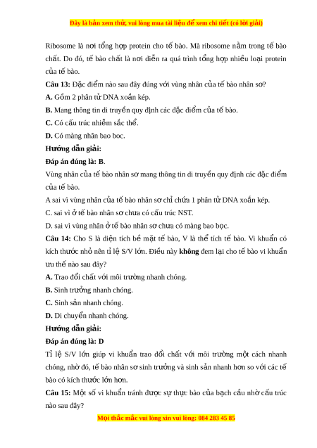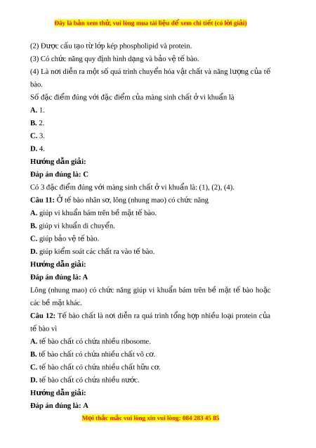 Đây là bản xem th , vu ử i lòng mua tài li u ệ đ xe ể m chi ti t (c ế ó l i ờ gi i ả ) (2) Đươc c u t â o t a ư l p kép phos ớ pholipid va protein. (3) Co ch c năng ư quy đ nh hi i nh d ng a va b o v a t ê bao. ê (4) La n i ơ di n ê ra m t ô s ô qua trinh chuy n ể hoa v t â ch t â va năng lư ng ơ c a u tê bao. Sô đ c đi ặ m ể đúng v i ớ đ c ặ đi m ể c a m u ang sinh ch t â vi ở khu n l â a A. 1. B. 2. C. 3. D. 4. Hư ng d ớ ẫn gi i ả : Đáp án đúng là: C Co 3 đ c đi ặ m ể đúng v i ớ mang sinh ch t â vi ở khuân la: (1), (2), (4). Câu 11: Ơ t bao ê nhân s , l