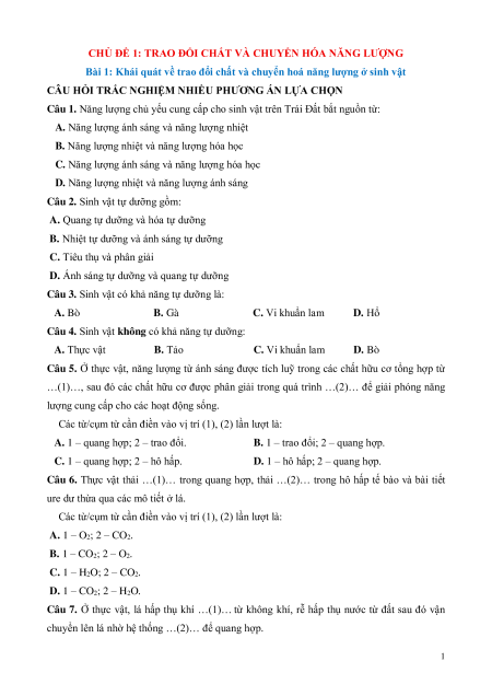 CHỦ ĐỀ 1: TRAO ĐỔI CHẤT VÀ CHUYỂN HÓA NĂNG LƯỢNG