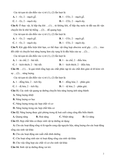 Câu 8. Ở thực vật, lá hấp thụ khí …(1)… từ không khí, rễ hấp thụ nước từ đất sau đó vận