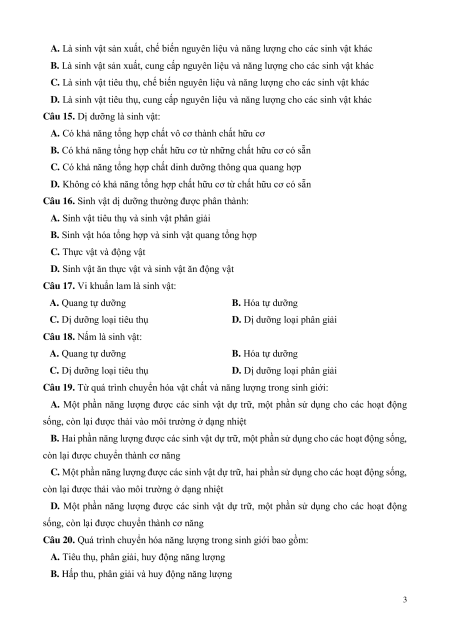 Câu 20. Quá trình chuyển hóa năng lượng trong sinh giới bao gồm: