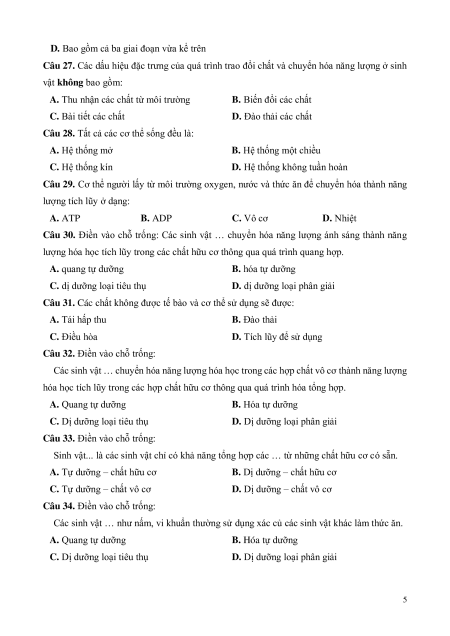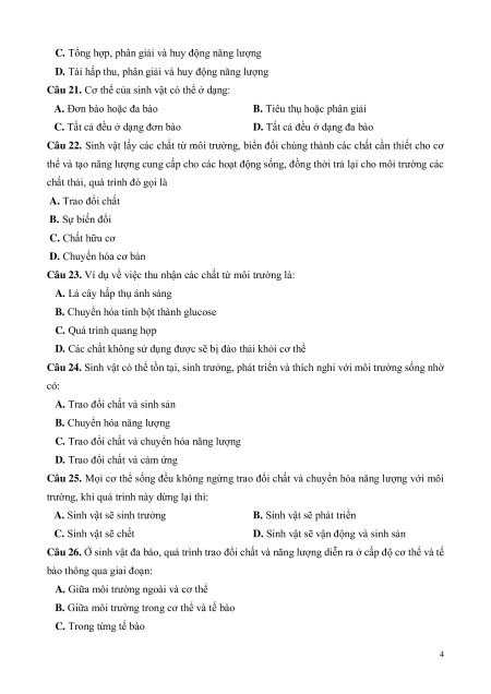 Câu 25. Mọi cơ thể sống đều không ngừng trao đổi chất và chuyển hóa năng lượng với môi