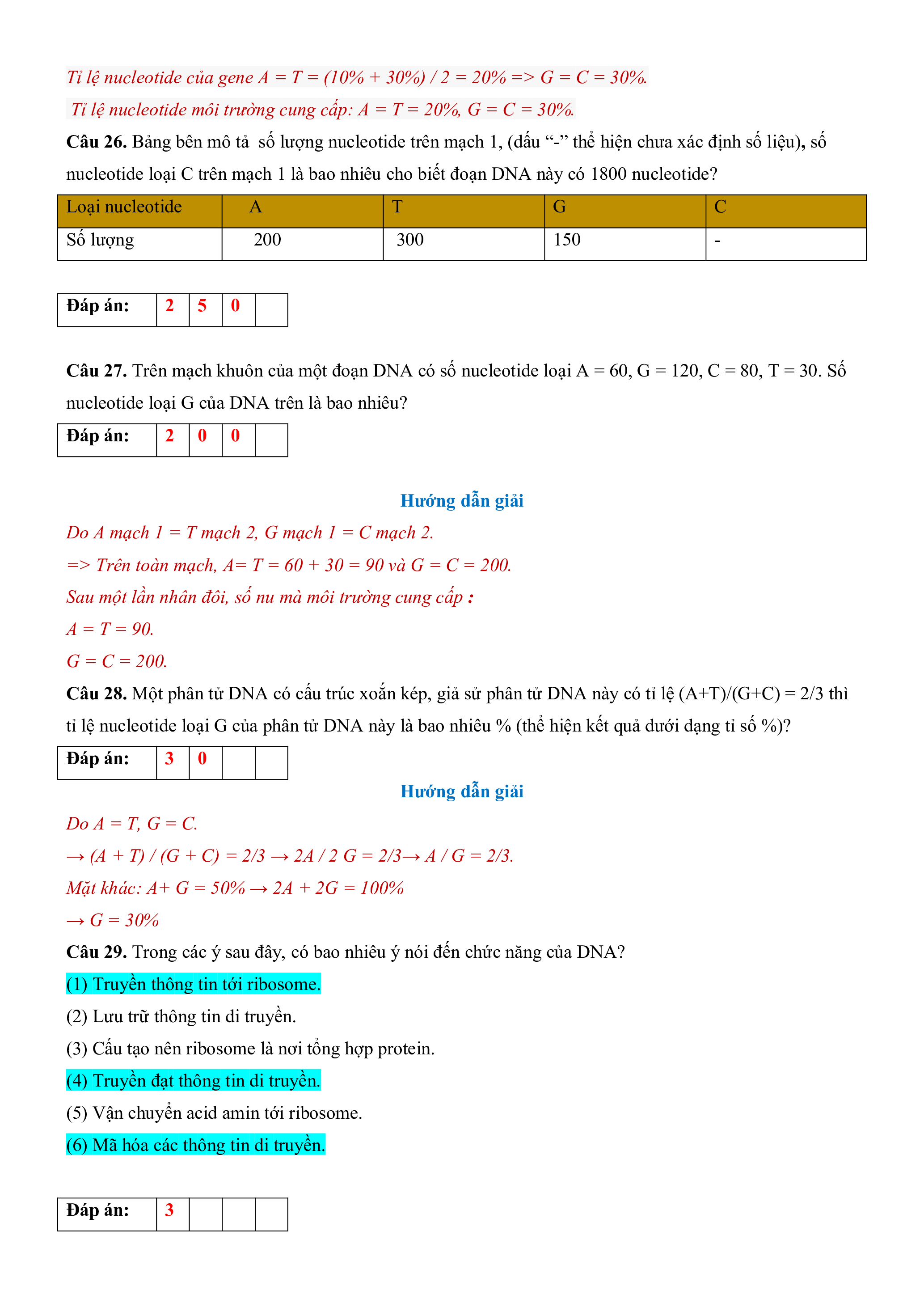 bằng số nucleotide loại T; số nucleotide loại G gấp 2 lần số nucleotide loại A; số nucleotide loại C gấp 3