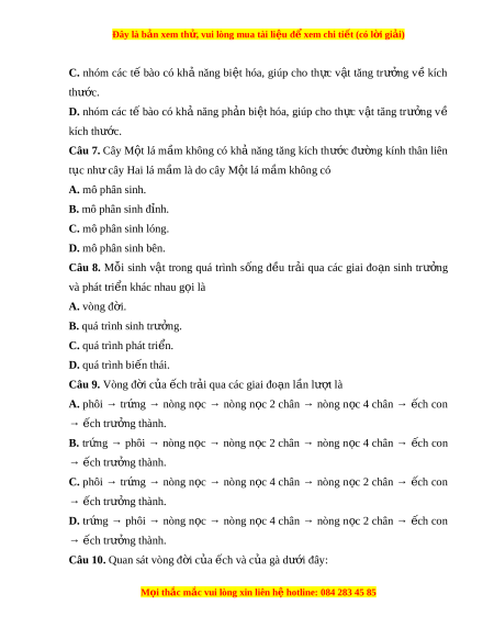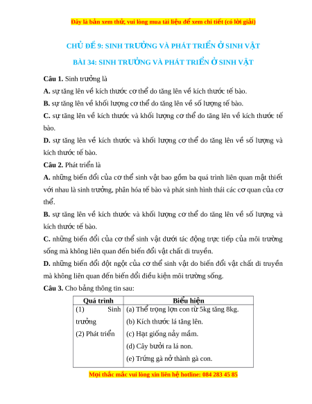 Đây là bản xem th , vu ử i lòng mua tài li u ệ đ xe ể m chi ti t (c ế ó l i ờ gi i ả ) CH Đ Ủ Ề 9: SINH TRƯ N Ở G VÀ PHÁT TRI N Ể SI Ở NH V T Ậ BÀI 34: SINH TRƯ N Ở G VÀ PHÁT TRI N Ể SI Ở NH V T Ậ Câu 1. Sinh trư ng l ở à A. s t ự ăng lên v kí ề ch thư c c ớ ơ th do t ể ăng lên v kí ề ch thư c ớ t bào. ế B. sự tăng lên v kh ề ối lư ng c ợ ơ th do t ể ăng lên v s ề l ố ư ng ợ t bào. ế