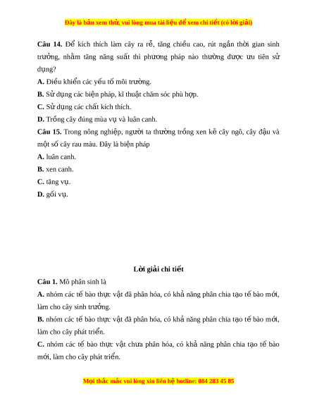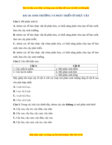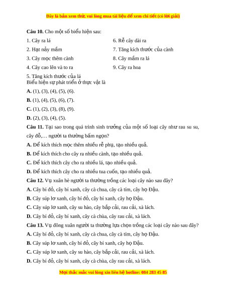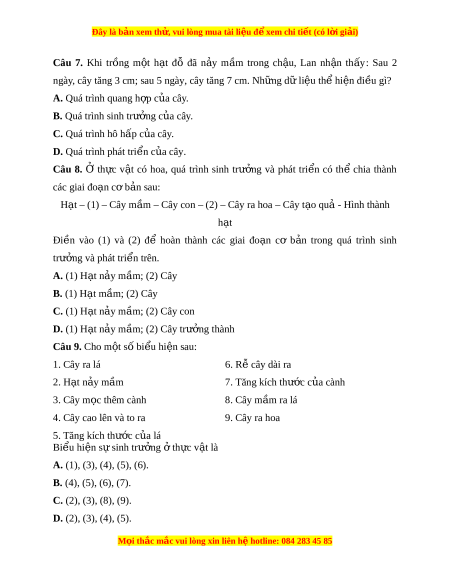 Đây là bản xem th , vu ử i lòng mua tài li u ệ đ xe ể m chi ti t (c ế ó l i ờ gi i ả ) Câu 10. Cho m t ộ số bi u hi ể n s ệ au: 1. Cây ra lá 6. Rễ cây dài ra 2. H t ạ n y m ả ầm 7. Tăng kích thư c ớ c a cành ủ 3. Cây m c t ọ hêm cành 8. Cây m m ầ ra lá 4. Cây cao lên và to ra 9. Cây ra hoa 5. Tăng kích thư c ớ c a ủ lá Bi u ể hi n s ệ phát ự tri n ể t ở h c v ự t ậ là