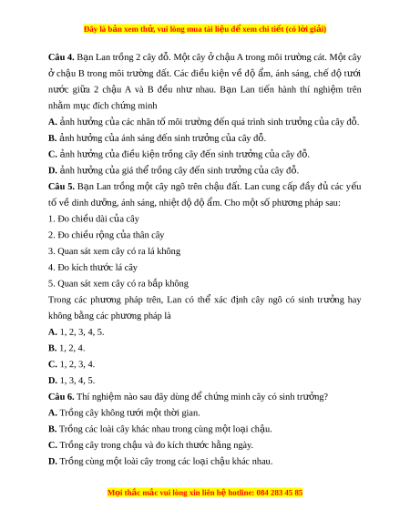 Đây là bản xem th , vu ử i lòng mua tài li u ệ đ xe ể m chi ti t (c ế ó l i ờ gi i ả ) Câu 4. B n ạ Lan tr ng ồ 2 cây đ . M ỗ t ộ cây ở ch u ậ A trong môi trư ng ờ cát. M t ộ cây ở ch u ậ B trong môi trư ng ờ đ t ấ . Các đi u ề ki n ệ v ề đ ộ m ẩ , ánh sáng, ch ế đ ộ tư i ớ nư c ớ gi a ữ 2 ch u ậ A và B đ u ề như nhau. B n ạ Lan ti n ế hành thí nghi m ệ trên nh m ằ m c đí ụ ch ch ng m ứ inh A. nh ả hư ng c ở a