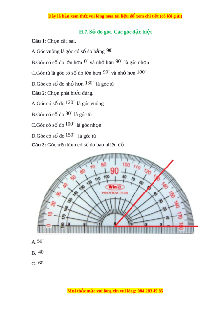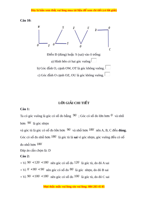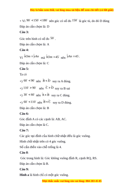 Đây là bản xem th , vu ử i lòng mua tài li u ệ đ xe ể m chi ti t ế (có l i ờ gi i ả ) Hình ch nh ữ t ậ trên có góc vuông. Câu 8: Cho hình v : ẽ Góc trong hình là: