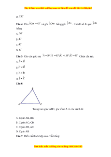 Trong tam giác ABC, góc đỉnh A có các c nh ạ là: A. C nh ạ AB, BC B. C nh ạ AC; CB C. C nh ạ AB, AC D. C nh ạ AB Câu 7: Đi n s ề ố thích h p vào ch ợ t ỗ r ng: ố M i