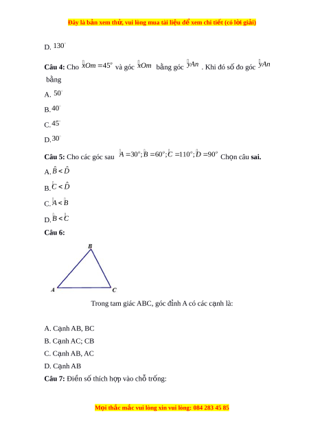 Đây là bản xem th , vu ử i lòng mua tài li u ệ đ xe ể m chi ti t ế (có l i ờ gi i ả ) D. 130 Câu 4: Cho 45o xOm và góc xOm b ng