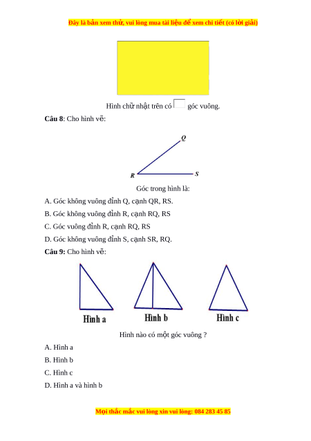 D. Góc không vuông đỉnh S, c nh SR ạ , RQ. Câu 9: Cho hình v : ẽ Hình nào có m t ộ góc vuông ? A. Hình a B. Hình b C. Hình c D. Hình a và hình b M i