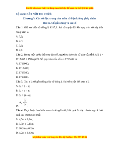 Câu 3. Cho a là số gần đúng c a ủ số đúng ā. Sai s t ố uy t ệ đ i ố c a a l ủ à A. ∆a = ā – a; B. ∆a = a – ā; C. ∆a = |ā – a|; a a a D. . Câu 4. Th c ự hi n ệ đo chi u ề cao c a ủ 4 ngôi nhà, k t ế qu ả đo đ c ạ nào trong các k t ế qu s ả au chính xác nh t ấ A. 4,5m ± 0,1m; B. 6,5m ± 0,15m; C. 20,3m ± 0,2m; D. 4,2m ± 0,12m. M i