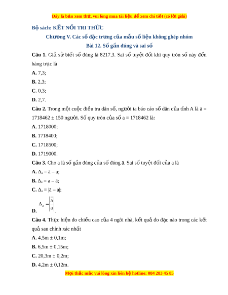 ố khi quy tròn số này đ n ế hàng tr c ụ là A. 7,3; B. 2,3; C. 0,3; D. 2,7. Câu 2. Trong m t ộ cu c ộ đi u ề tra dân s , ố ngư i ờ ta báo cáo s ố dân c a ủ t nh ỉ A là ā = 1718462 ± 150 ngư i ờ . S quy t ố ròn c a s ủ ố a = 1718462 là: A. 1718000; B. 1718400; C. 1718500; D. 1719000.